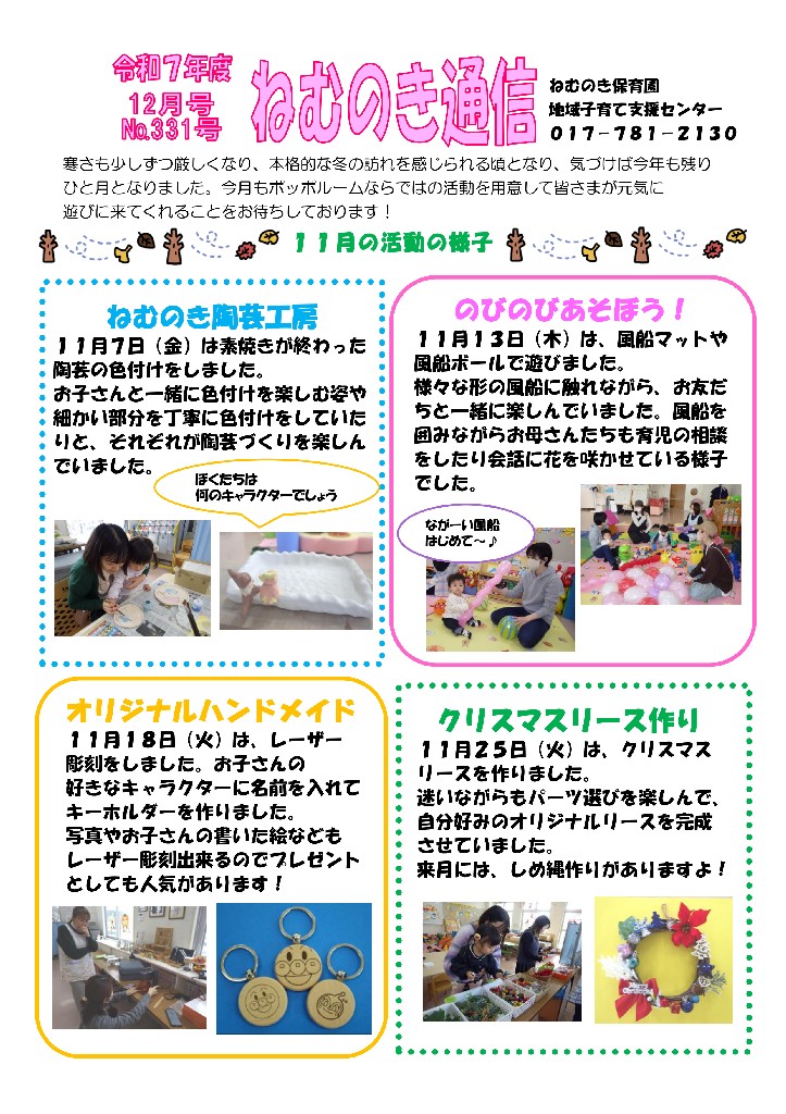 ねむのき通信を毎月発行しています。(ねむのき保育園支援センター内掲示)